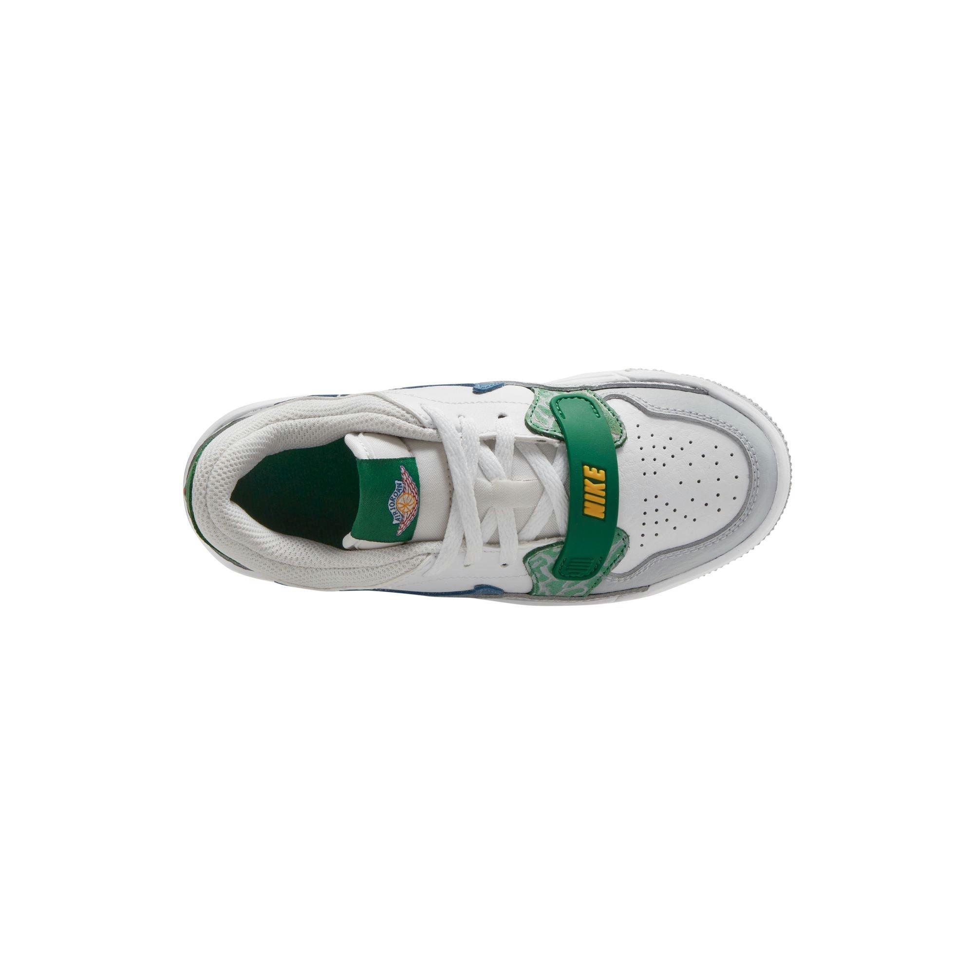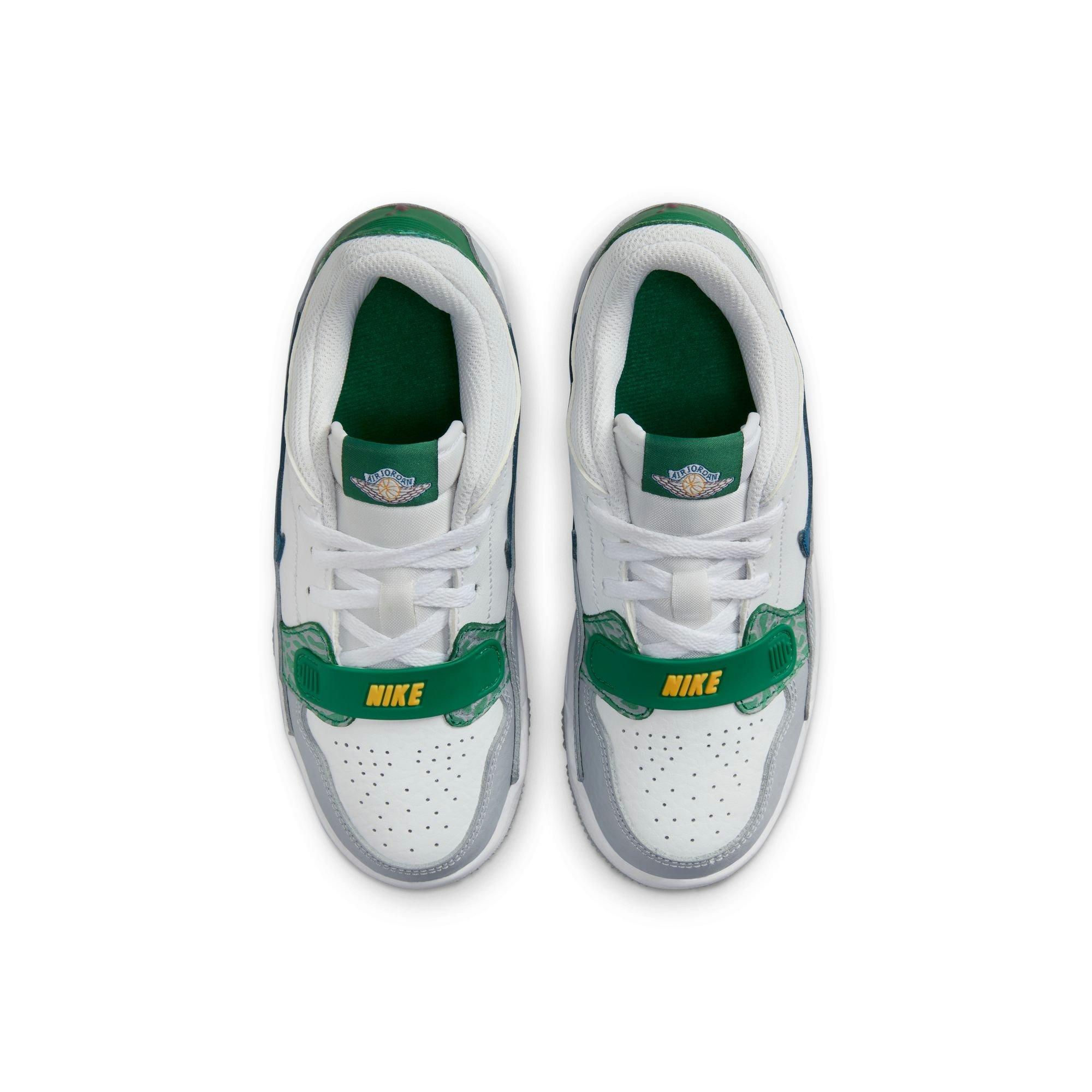 The Jordan Legacy 312 Low Preschool Boys' White/Industrial Blue/Wolf Grey Shoe celebrates MJ's legacy with this shout-out to Chicago's 312 area code. The design creates a modern mash-up of iconic Jordan shoe elements.